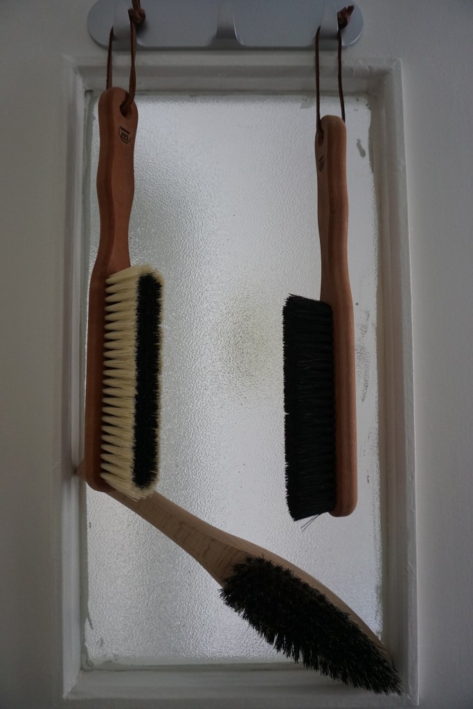 Outra dica de cuidado com as roupas é ter escovinhas adequadas para peças que não podem ser lavadas e/ou precisam de lavagem à seco. Cada uma dessas escovas é adequada para um tipo de tecido e fibra, e eu procuro ter especial cuidado com camurças.