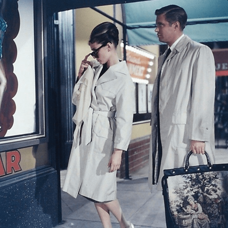 Pouco depois, os trench coats passaram a fazer parte da vida civil, na medida em que os soldados que voltaram da guerra usavam a peça no dia a dia. E aí Hollywood colocou essa peça em algumas estrelas de cinema: Humphrey Bogart usou um trench coat em Casablanca, e Audrey Hepburn fez o mesmo em Bonequinha de Luxo.