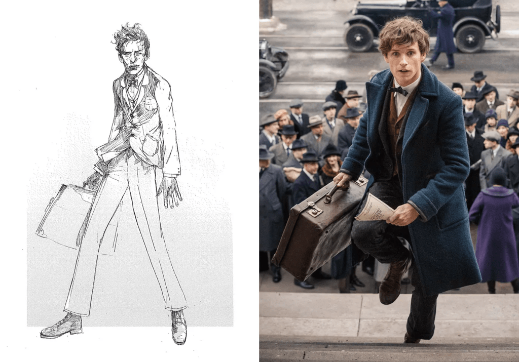 Atwood conseguiu isso vestindo Newt com uma cor profunda de pavão – justaposta ao marrom de seu colete e aos tons quentes e opacos que estavam em voga na década de 20. Além da combinação descoordenada, ela deixou as roupas dele mal ajustadas o suficiente para adicionar um pouco de peculiaridade ao personagem. Atwood também aprimorou o casaco com uma característica especial de bruxo: “Colocamos todos os tipos de bolsos, onde ele poderia guardar poções e curas e, claro, alguns de seus amiguinhos. A maioria dos bolsos secretos está dentro do casaco, então [o público] vê muito pouco deles, mas todos têm uma razão para estar lá.”