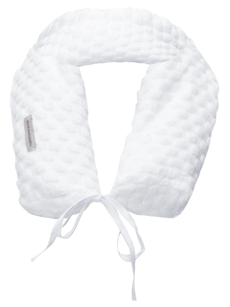 No mesmo espírito da almofada terapêutica, a echarpe tem o formato perfeito para encaixar no pescoço e proporcionar relaxamento.